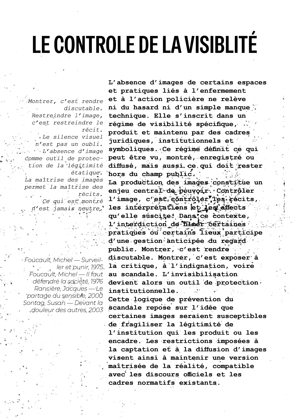 Contrairement à la prison, qui est par nature soustraite au regard, la police exerce l’essentiel de son mandat dans l'espace public. Pourtant, l’institution policière s’est érigée en véritable forteresse. Son inaccessibilité ne repose pas sur des murs de béton, mais sur un entrelacs de verrous juridiques, de réflexes corporatistes et de manœuvres d’intimidation qui visent à préserver le monopole du récit sécuritaire. Documenter l’action des forces de l’ordre de l’intérieur, ou même simplement sur le terrain, est devenu une épreuve de force permanente pour la presse et les chercheurs.