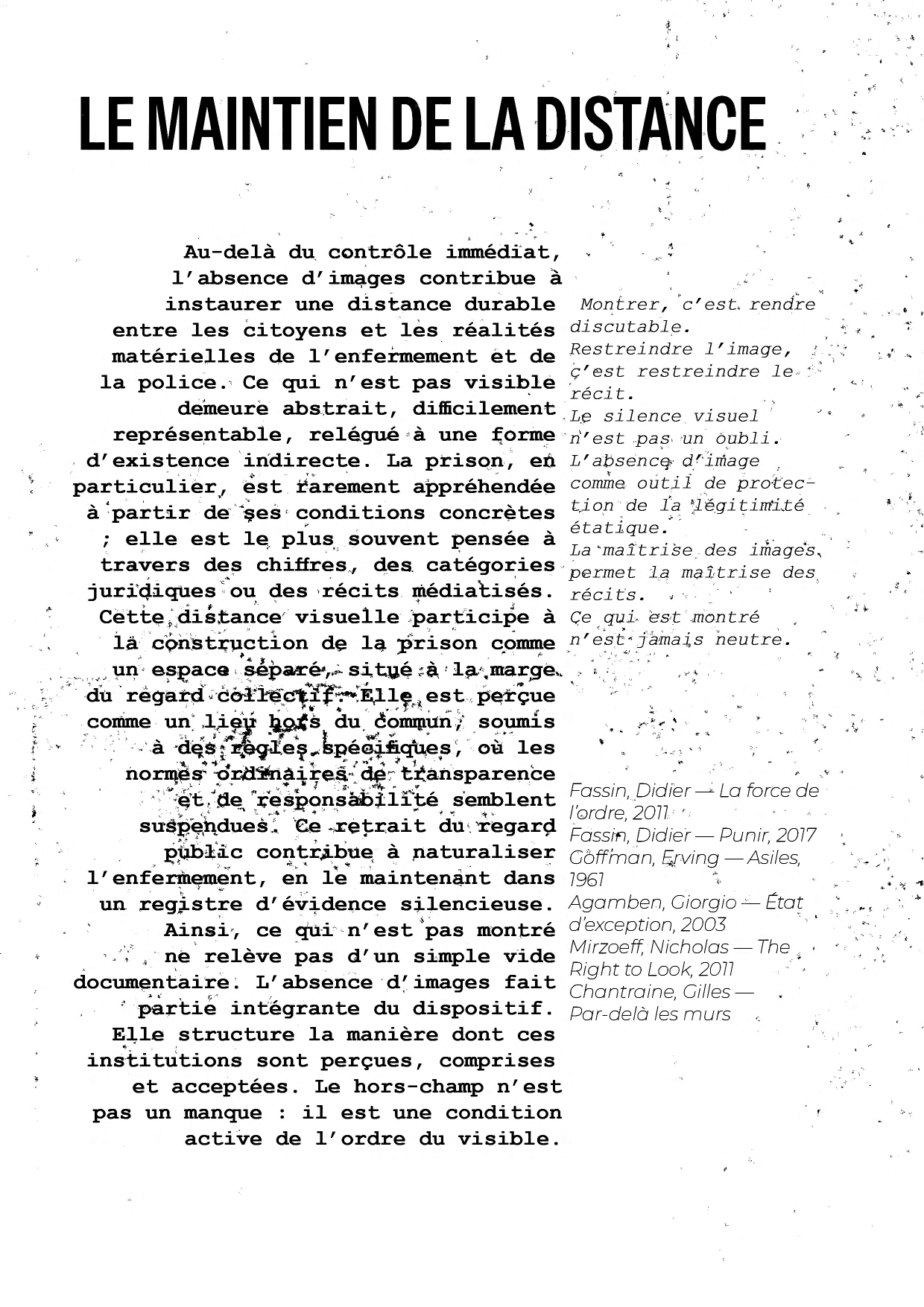 La prison est le seul service public dont l’architecture a été pensée, dès l'origine, pour soustraire son fonctionnement au regard de la société. Mais les murs d'enceinte et les barbelés ne sont que la face visible de cette inaccessibilité. L’opacité carcérale est avant tout une forteresse bureaucratique et juridique qui, sous couvert d’impératifs de sécurité, confisque l’information et neutralise la responsabilité de l’État. L'anthropologue Didier Fassin qualifie d'ailleurs ce phénomène de « secret public bien gardé » : la société sait que les conditions y sont désastreuses, mais l'absence d'images et de récits bruts empêche toute prise de conscience politique réelle.