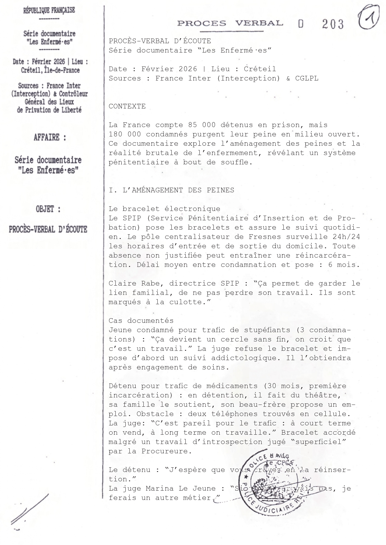 L'opacité policière trouve sa justification légale la plus puissante dans le Code de procédure pénale : le secret de l'enquête et de l'instruction. Si ce principe a été conçu pour protéger la présomption d'innocence et l'efficacité des investigations, il est aujourd'hui massivement utilisé comme un outil de verrouillage institutionnel. Reporters Sans Frontières (RSF) dénonce régulièrement l'impossibilité pour les journalistes d'être « embarqués » de manière indépendante avec les forces de l'ordre. Lorsqu'une équipe de télévision est autorisée à suivre une patrouille, c'est au prix d'une validation stricte du Service d'Information et de Communication de la Police Nationale (SICoP). Les reportages se transforment alors en opérations de communication validées par la place Beauvau. Dès qu'une affaire devient sensible ou qu'un journaliste indépendant tente de franchir les portes d'un commissariat pour documenter le traitement des gardes à vue ou les méthodes d'interrogatoire, le secret de l'enquête est immédiatement invoqué pour bloquer tout accès.