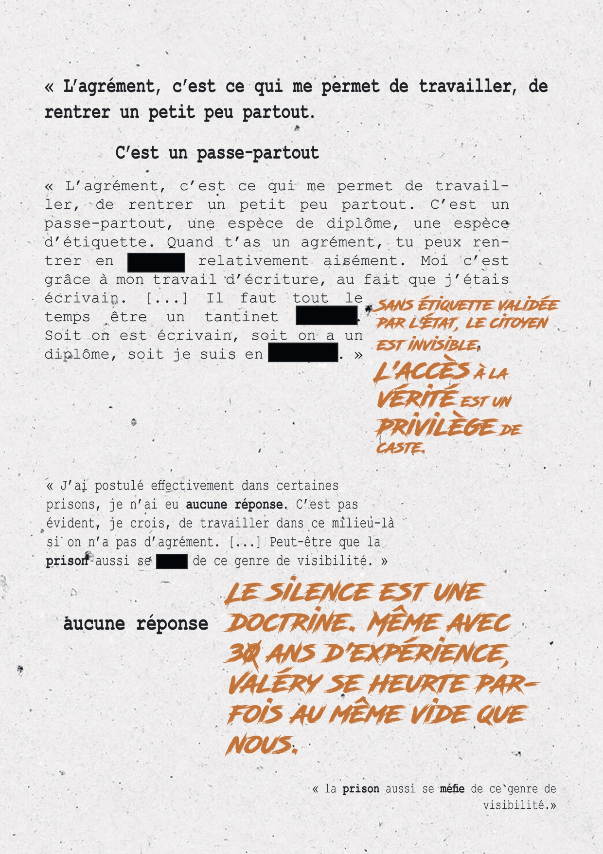 La prison est le seul service public dont l’architecture a été pensée, dès l'origine, pour soustraire son fonctionnement au regard de la société. Mais les murs d'enceinte et les barbelés ne sont que la face visible de cette inaccessibilité. L’opacité carcérale est avant tout une forteresse bureaucratique et juridique qui, sous couvert d’impératifs de sécurité, confisque l’information et neutralise la responsabilité de l’État. L'anthropologue Didier Fassin qualifie d'ailleurs ce phénomène de « secret public bien gardé » : la société sait que les conditions y sont désastreuses, mais l'absence d'images et de récits bruts empêche toute prise de conscience politique réelle.